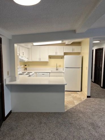 Off-street parking, with some garages, when available at $80/mo. This unit has a sliding glass door to an outdoor deck, a full size dining room, and a kitchen with an island. There are 13 closets in this unit.